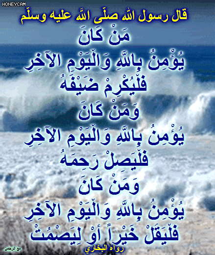 عن أبي سَلَمَة ابن عبد الرَّحمن بن عوف رضي الله عنه عن أبي هريْرة رضي الله عنه عن النَّبِيّ صلَّى اللَّه عليه وسلَّم أنَّه قَال: "مَنْ كَانَ يُؤْمِنُ بِاللَّهِ وَالْيَوْمِ الآخِرِ فَلْيُكْرِمْ ضَيْفَهُ، وَمَنْ كَانَ يُؤْمِنُ بِاللَّهِ وَالْيَوْمِ الآخِرِ فَلْيَصِلْ رَحِمَهُ ، وَمَنْ كَانَ يُؤْمِنُ بِاللَّهِ وَالْيَوْمِ الآخِرِ فَلْيَقُلْ خَيْراً أَوْ لِيَصْمُتْ" ... رواه البخاري رسالة ترحيب